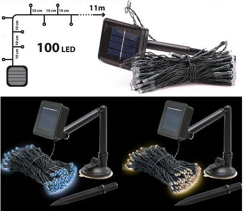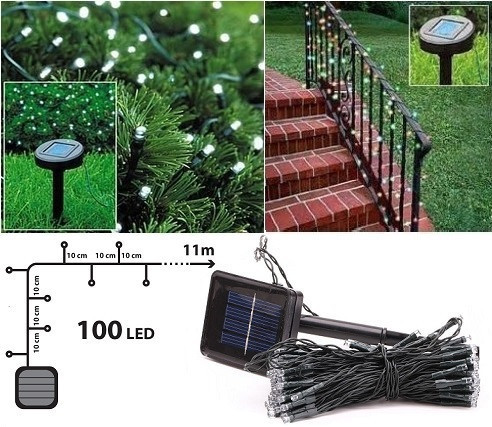 100 LED-es dekorációs füzér solar töltővel és beépített akkumulátorral. Kültéren és beltéren is használható, rátekerheted a kerti fákra, bokrokra, bejáró szélére, az erkély korlátjára, napernyőre, ablakpárkányra, kerítésre, ereszcsatornára, vagy ahová csak szeretnéd. A lámpa alkonykapcsolóval rendelkezik, így sötétedéskor automatikusan bekapcsol, majd világosban automatikusan ki. A szolár cella a cserélhető rúd akkumulátort napközben feltölti, így egy verőfényes napsütéses napot követően akár egész éjszakán keresztül világít az alacsony fogyasztású LED technológiának köszönhetően. Télen és nyáron is jól használható hangulatos díszkivilágításra, vagy csak irányfénynek is.