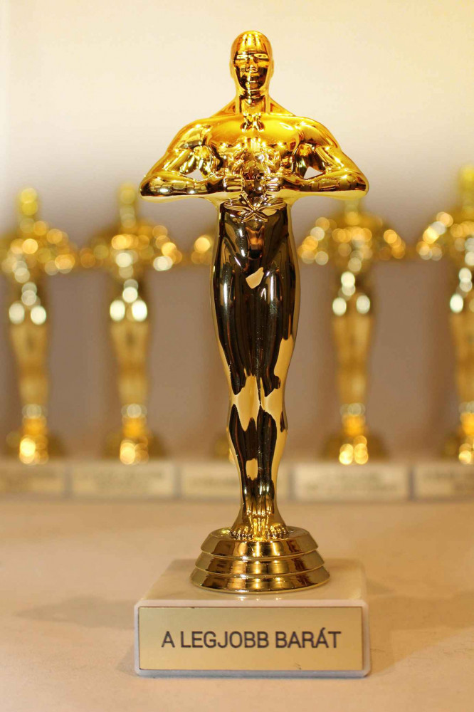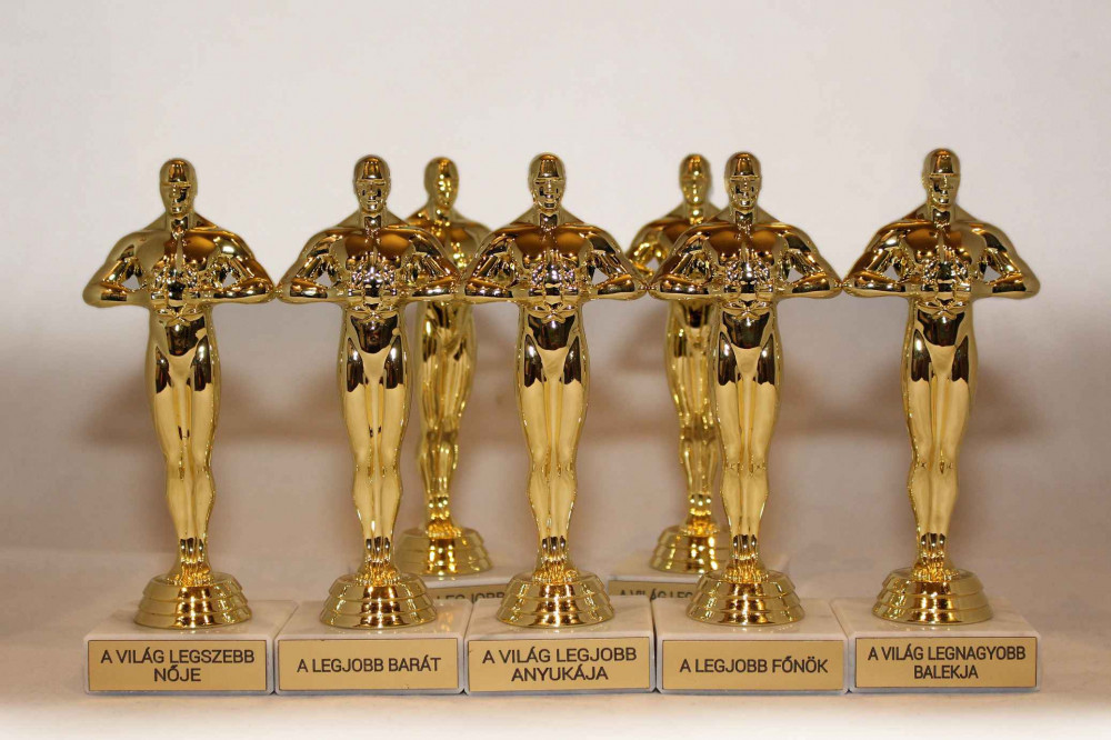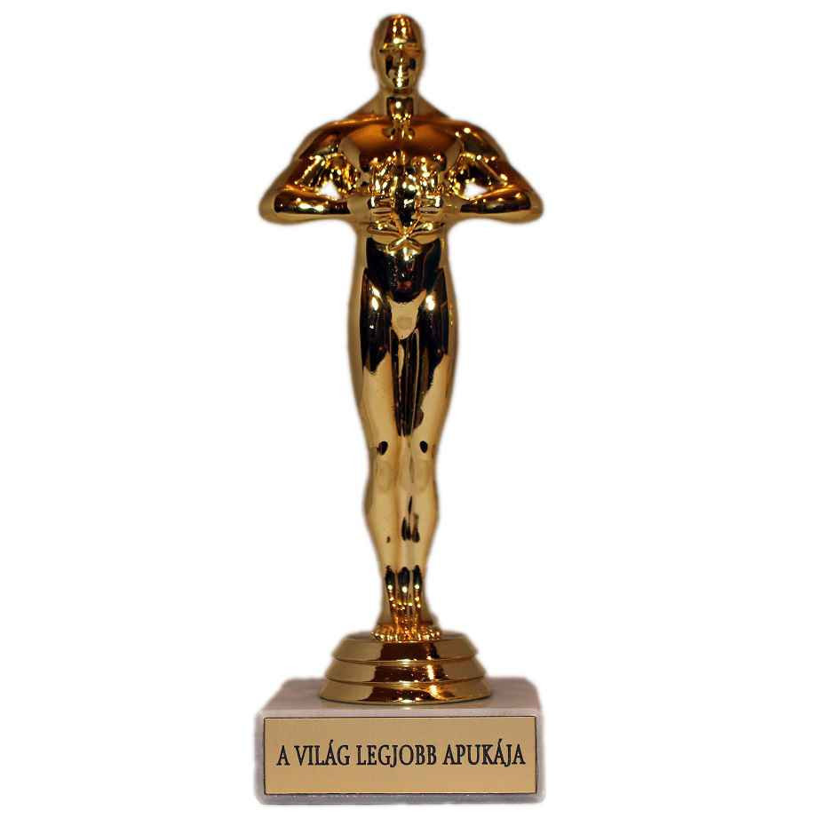 Ki kaphat Oscar díjat? Szerencsére már nem csak a filmesek, hanem akár Te is! Persze az öndícséret nem a legjobb, így az ajándékozás a legjobb megoldás. És az Oscart kapja a legjobb főnök, az év apukája, a világ legjobb felesége, stb. Az ötletek tárháza végtelen. Ugyan ki nem szeretné, ha egy aranyozott Oscar szobor valódi márvány talpon a nevével díszelegne a vitrinjében? Szinte bármilyen alkalmat megragadhatsz a díjazásra! Lehet a legjobb női alakításért, egy hisztit követően, vagy a legjobb férfi alakításért adni, ha megfelelő a meséd egy haverokkal átmulatott éjszakát követően. Vagy megkaphatod a legjobb férfi mellékszereplőként, ha például nincs szavad otthon. A legnyerőbb ajándék versenyekre, szülinapra, évfordulóra, stb. Az aranyozott Oscar szobor talpazata valódi nemes márványból készült. A talpra elhelyezett aranyszínű táblácskára tudjuk gravírozni az általad megadott egyedi szöveget. Csak arra vigyázz, hogy az átadást követően a díjazott nehogy igazi Hollywoodi köszönőbeszédbe fogjon, hogy köszönöm a szüleimnek, a tanáraimnak és Marika néninek! Köszönöm a kollégáimnak, hogy...