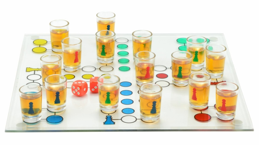 Játékszabály: A Ki nevet a végén? italozós társasjáték, az ismert és közkedvelt társasjáték felnőtt változata. Ez a játék egyszerűen nagyszerű! Van hozzá egy üvegtábla, üveg snapszos poharak és egy dobókocka. Hogy is kell ezt játszani? Pofonegyszerű! A bábuk a kis snapszos poharak, melyeket a játék kezdetekor fel kell tölteni. Mikor az egyik játékos átugorja vagy kiüti az ön bábuit", a benne lévő italt meg kell innia, majd újratöltenie a poharat. Ha célba ér egy bábujával, önnek kell felhörpintenie a győztes poharat, majd üresen visszatennie a táblára. Az győz, aki mind a négy poharával célba ér. Nagyon szórakoztató és ajánlott társasjáték!