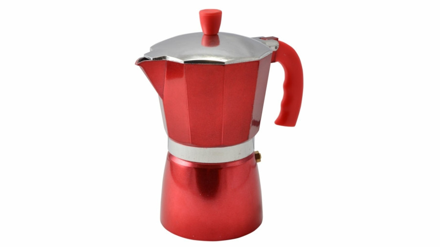 Hagyományos kotyogó kávéfőző kívül piros színben műanyag fogóval ellátva, hogy ne melegedjen át, mint az alumínium. 6 csésze kávé elkészítésére alkalmas.
