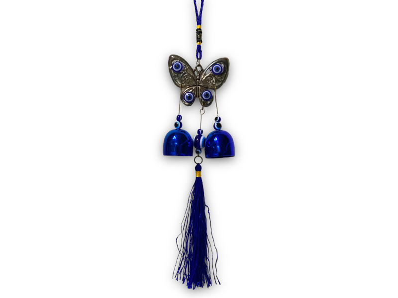 Egyedi design: A szélcsengő egy gyönyörűen kidolgozott pillangóval díszített, amelyhez két kék harang kapcsolódik. A pillangó és a harangok is Nazar szemekkel vannak díszítve.