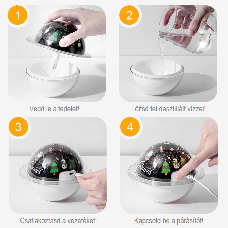 Csöpögtess a tartályba olajmentes illatosító parfümöt, aromát és a szoba hangulata azonnal megváltozik! A hangulatot fokozza az univerzum, óceán, vagy karácsonyi világító LED design. Ha száraz a levegő és nem tudsz aludni éjjel, töltsük föl a tartályt lehetőleg desztillált vízzel, majd 2-4 csepp olajmentes parfümöt csöppents a tartályba! A desztillált víz a készülék élettartamát nagyban növeli, hiszen nem keletkeznek a kemény víz miatt lerakódások a párologtató diffuzorában. Fűtés szezonban kimondottan javasolt a használata! Beüzemelése igazán egyszerű, használata biztonságos és csendes. A speciális technológiának, a finom ultrahangos porlasztásnak köszönhetően többé már a vízcseppek, vízfoltok miatt sem kell aggódnod. Egyszerűen és könnyen karbantartható, a hosszú élettartam hosszú távú megoldás jelent, hogy élvezhesd a minőségi ultrahangos párásítás előnyeit.