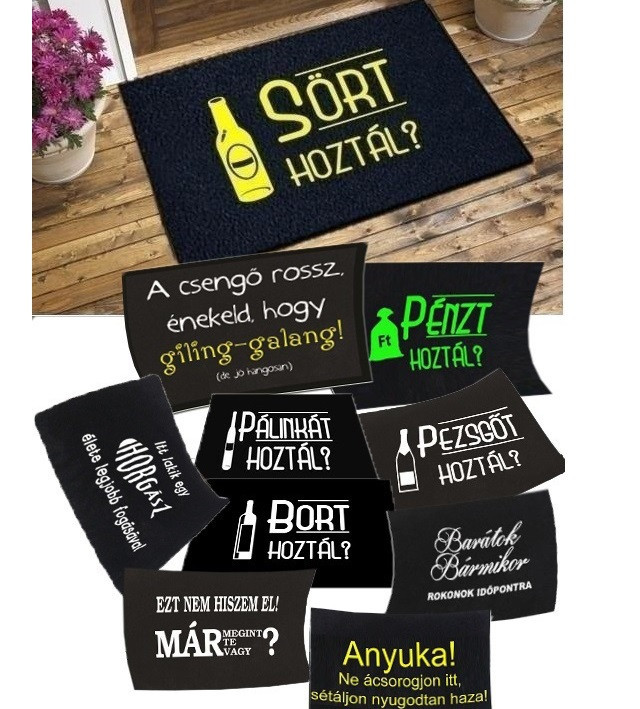 Hogyan várod a vendégeket? Mert amennyiben nem szereted a szürke hétköznapokat és nem vagy besavanyodva, igazán neked való lesz valamelyik lábtörlő. Érkezhet hozzád Húsvéti locsolkodó, szilveszteri vendég, házibuli meghívott, családtag, barát, vagy barátnő, az anyós, a postás, a villanyszámlás, a díjbeszedő. Rögtön tudják majd, hogy mihez tartsák magukat! Használata nagyon egyszerű. Tedd le az ajtóhoz és ajtónyitáskor figyeld a vigyorgó fejeket! Használhatod munkahelyen is, tedd az íróasztalod elé, hogy aki munkát hoz neked, az tudja, hogy mibe fog neki kerülni! Tudathatod a világgal, hogy nyugdíjas vagy, vagy hogy csontot kell hozni a kutyának! Horgászoknak is van lábtörlő, de az anyósnak is kirakhatsz egyet, kedved szerint. A lényeg a vidámság, mert mosolyogni ugye mindig érdemes!
