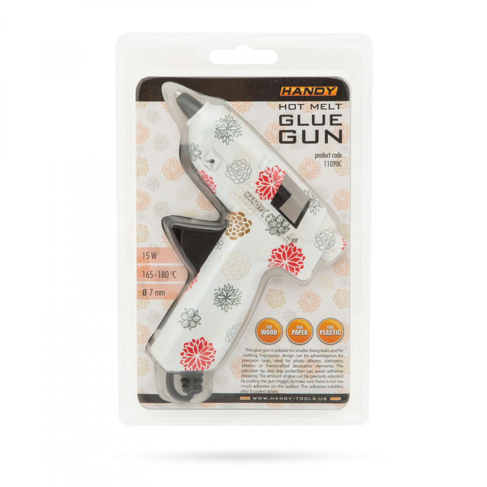 Ragasztópisztoly 7 mm-es ragasztórúdhoz. Alkalmas például dekorációs ragasztási feladatokhoz, barkácsoláshoz. Az ergonomikus kialakítás előnyös lehet precíziós feladatoknál, ideális fotóalbumokhoz, papír-írószerekhez, műanyagokhoz vagy saját magunk által készített dekorációs elemekhez. A precíziós csúccsal és a csepegés védelemmel elkerülhető a ragasztófolyás. A ragasztómennyiség a pisztoly ravasz húzásával adagolható, így nem kerül egyszerre túl sok ragasztó a ragasztani kívánt felületre. A megolvadt ragasztórúd, miután lehűlt újra megszilárdul és ezzel összeragasztja a dolgokat.